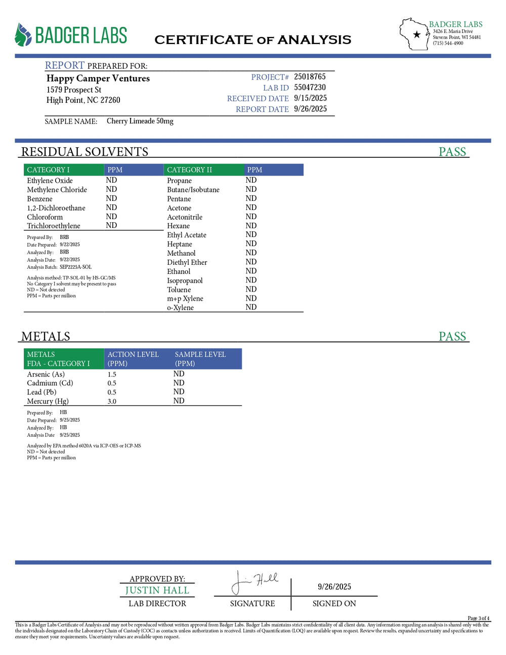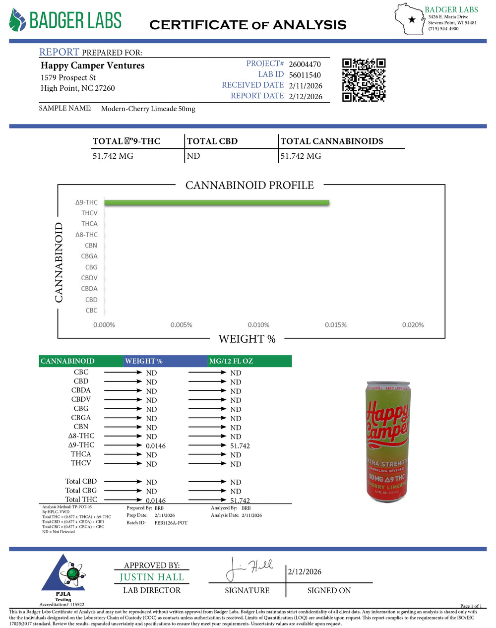 Happy Camper beverages are crafted with premium, lab-tested hemp extract using a proprietary infusion process that ensures purity, consistency, and fast-acting effects. Each drink blends real fruit flavors, natural ingredients, and sparkling water for a refreshingly smooth and elevated experience.