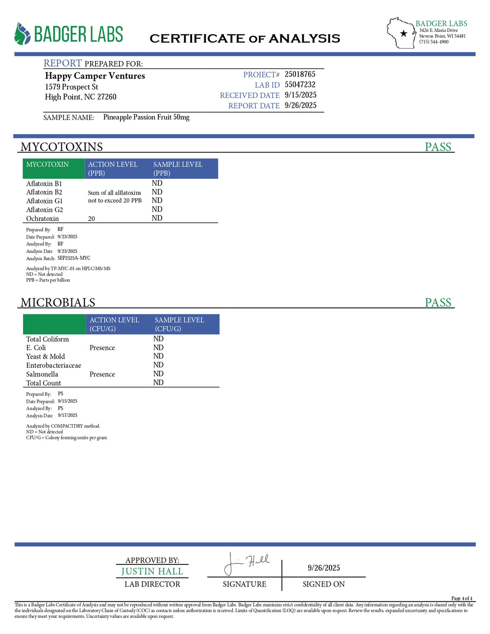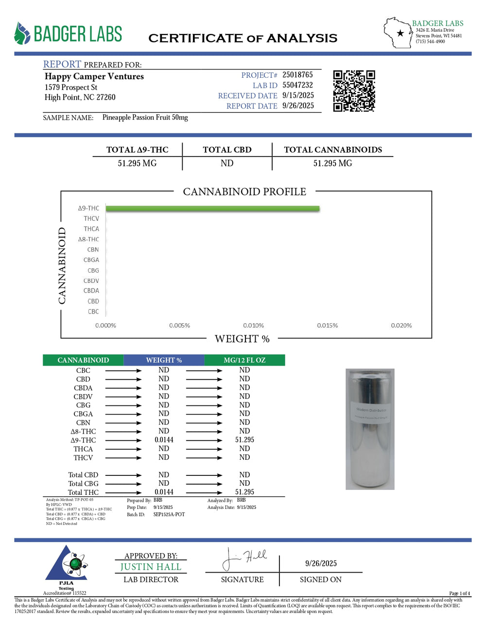 Happy Camper beverages are crafted with premium, lab-tested hemp extract using a proprietary infusion process that ensures purity, consistency, and fast-acting effects. Each drink blends real fruit flavors, natural ingredients, and sparkling water for a refreshingly smooth and elevated experience.